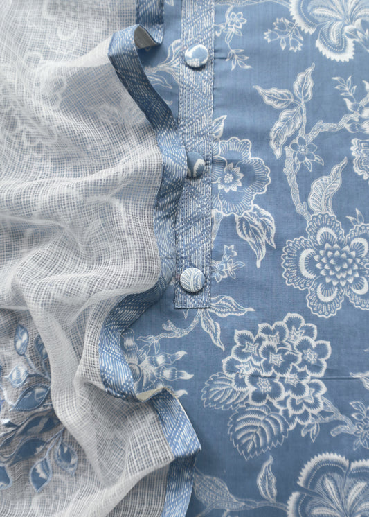 Blue Pure Cotton Suit Set With Kota Doria Dupatta And Appliqué Work