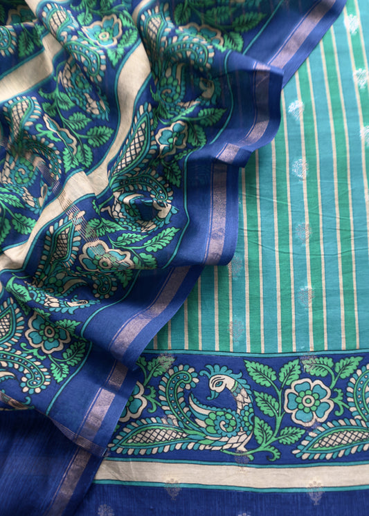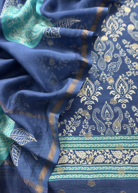 Blue Pure Maheshwari Silk Unstitched Suit fabric with Banarasi bootis and Kalamkari print