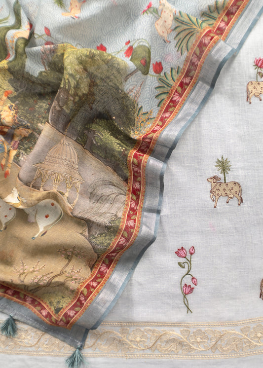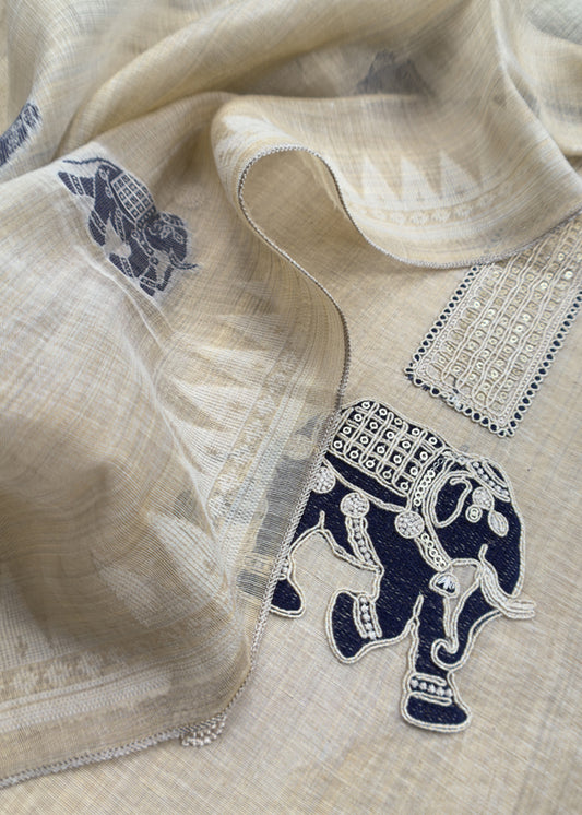 Blue Pure Linen Haathi Embroidered Suit With Jamdani Weaving