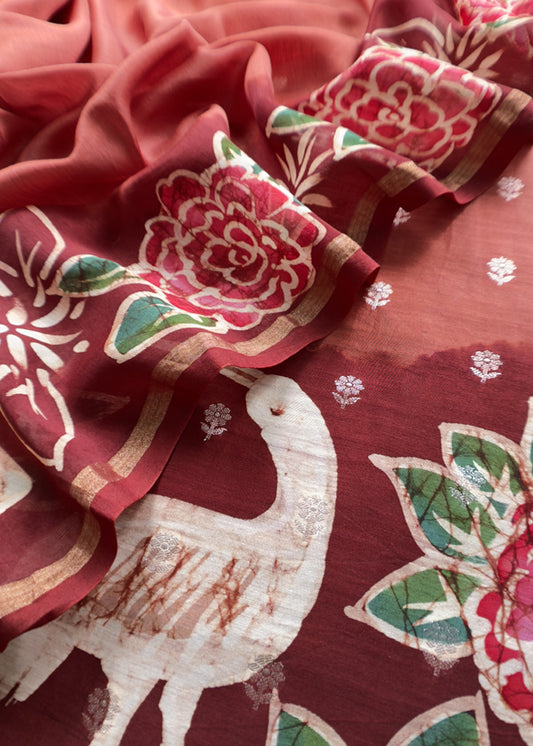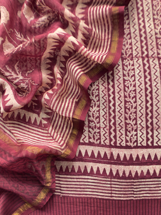 Brown Red Blockprint Handloom Maheshwari Silk Suit fabric