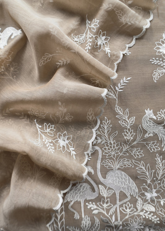 Brown Mul Chanderi Suit With Flamingo And Peacock Embroidery