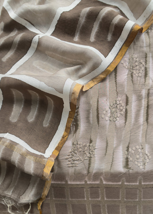 Chikoo Grey Pure Organza Silk Unstitched Suit With Peonies Brush-Print Dupatta