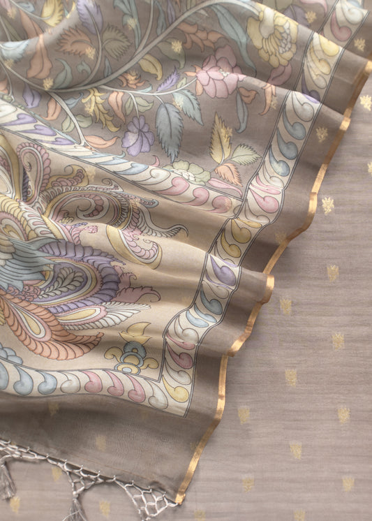 Chikoo Grey Handloom Banarasi Suit Set With Kalamkari Organza Dupatta