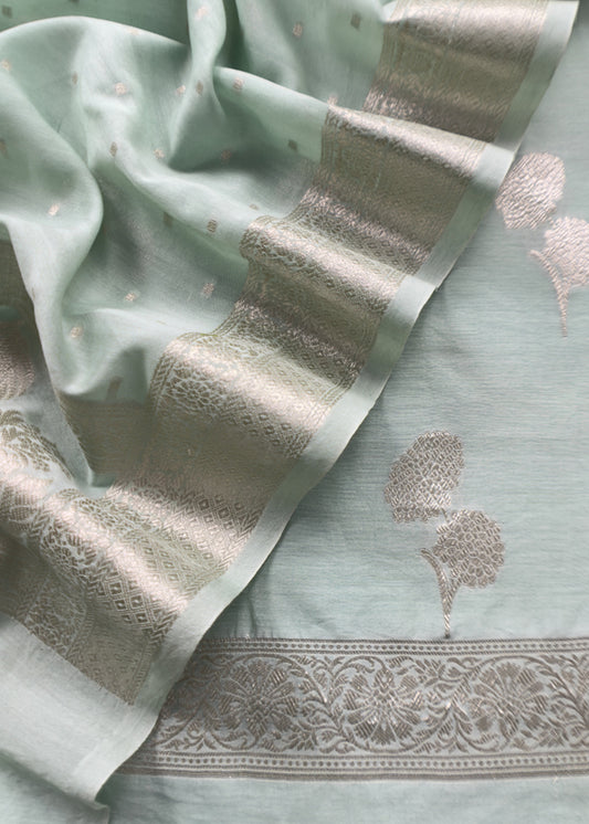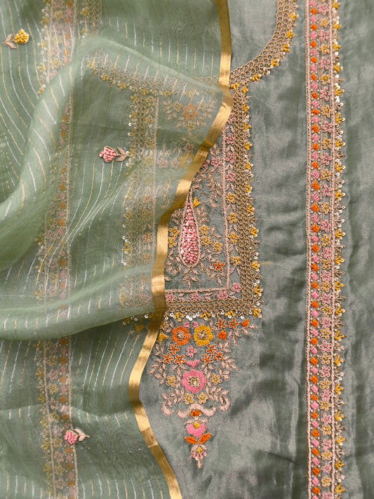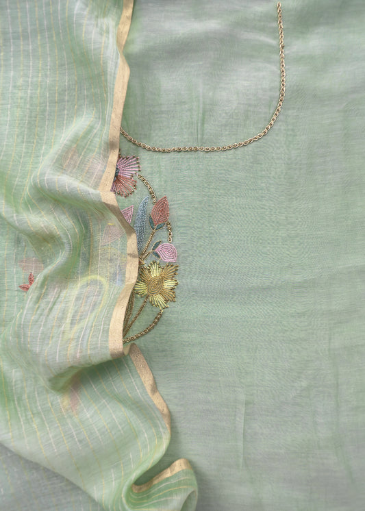 Fern Green Premium Mul Chanderi Suit With Gold Resham Embroidery