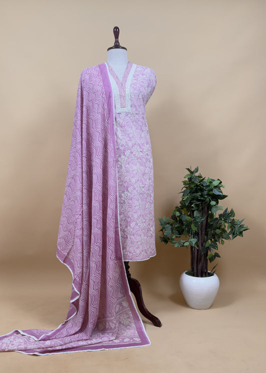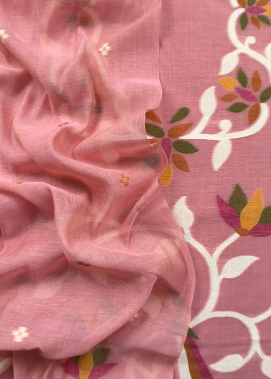 Flamingo Pink Chidiya Jamdani Suit In Linen Chanderi Fabric