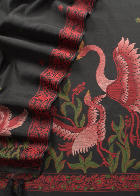 Flamingo flables Slate Black Chanderi suit set with Jamdani weaving