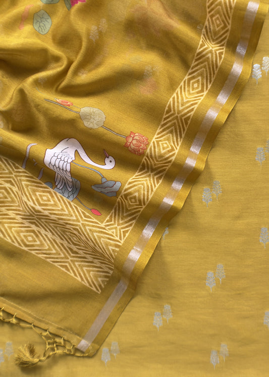 Flamingo flables Mustard Yellow Handloom Banarasi unstitched suit set