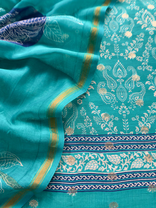 Firozi Pure Maheshwari Silk Suit With Banarasi Bootis