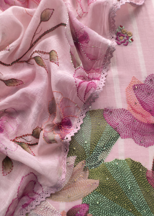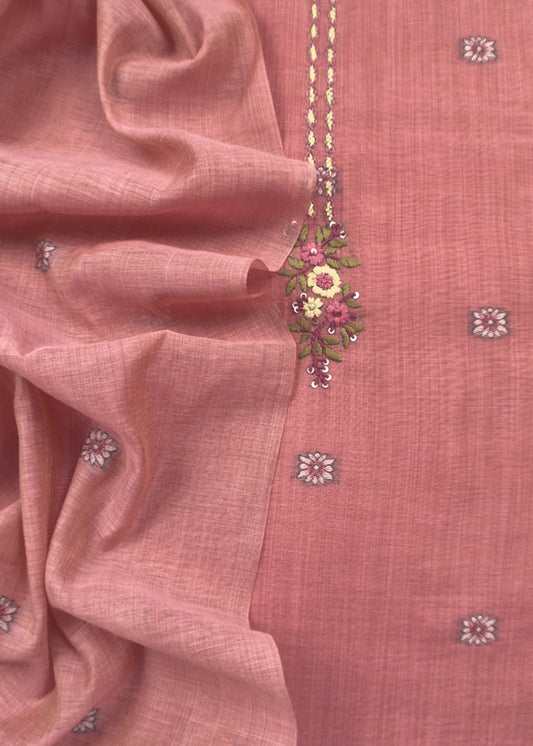 Flamingo Pink Or Baby Pink Pure Linen Suit Fabric With Kantha embroidery