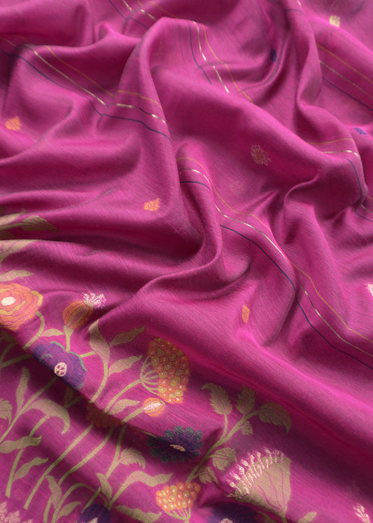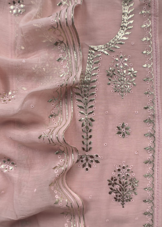 Flamingo Pink Handloom Mul Chanderi Suit With Gold Pitta Hand Work And Embroidery