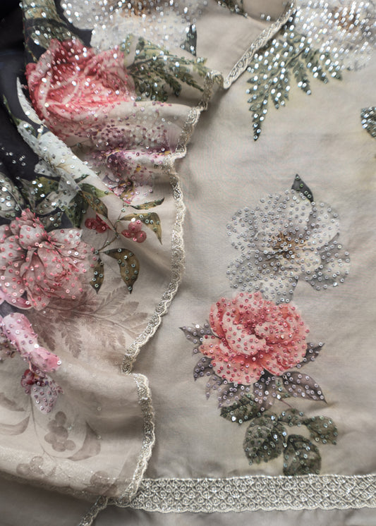 Floral Paradise Cheeku Charcoal Floral Sequin Suit In Pure Kora Silk Fabric
