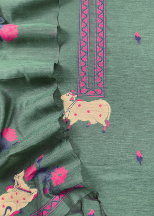 Forest Green Unstitched Chanderi Dupatta-Suit With Pichwai Jamdani Weaving