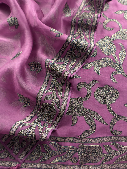 French Violet Pure Organza Silk Suit Fabric With Parsi Tulips Resham Embroidery