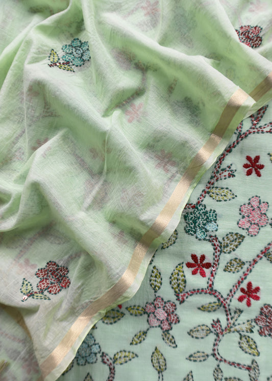 Fresh And Wild Green Kantha Embroidered Suit In Pure Mul Chanderi