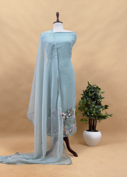 Garden Of Dreams Powder Blue Handloom Crushed Organza Silk Suit With Appliqué work and 3d French Hand embroidery