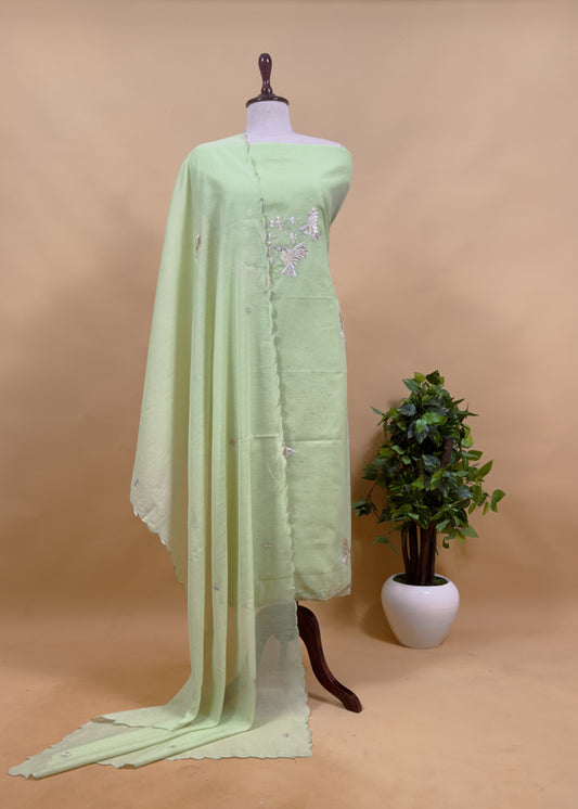Girlish Pastel Green Gold Silver Chidiya Pure Mulmul Suit Fabric With Pitta Work