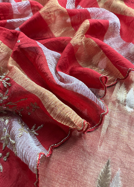 Gold And Red Pure Tissue Silk Woven Suit Fabric With Cutdana Handwork
