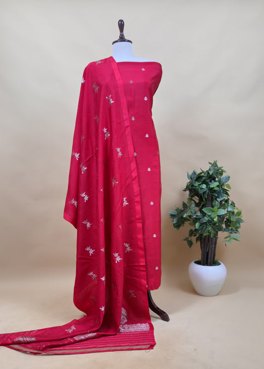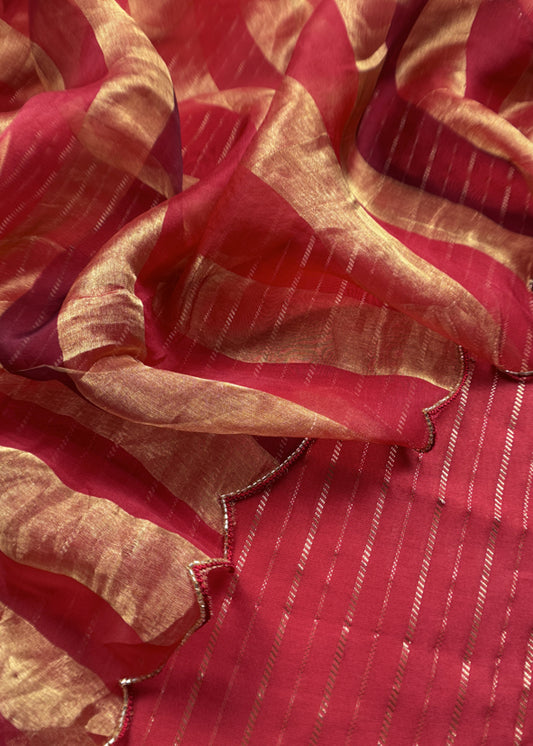Gold And Red Pure Tissue Silk Woven Suit Fabric With Cutdana Handwork