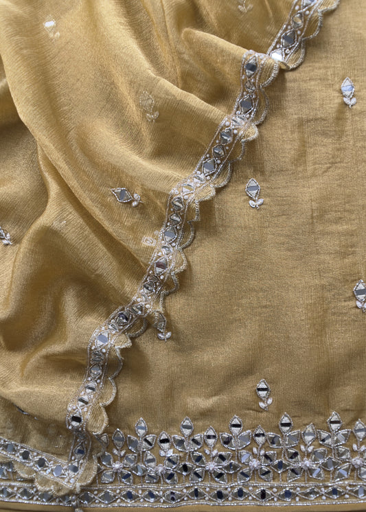 Gold Pure Tissue Silk Unstitched Suit with Real Mirrors Handwork