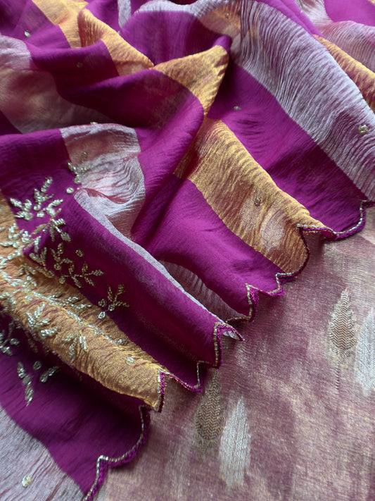 Gold And Wine Pure Tissue Silk Woven Suit Fabric With Cutdana Handwork