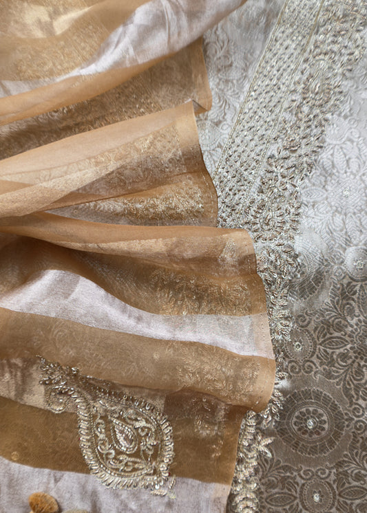 Golden Brown Embroidered Crush Tissue Silk Suit