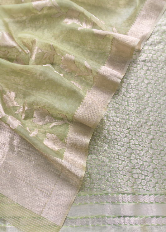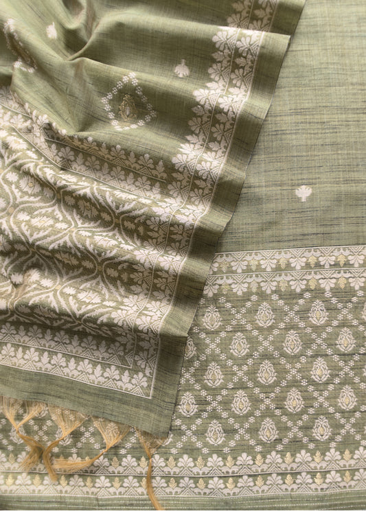 Green Chanderi Unstitched suit with Gold zari Jamdani weaving