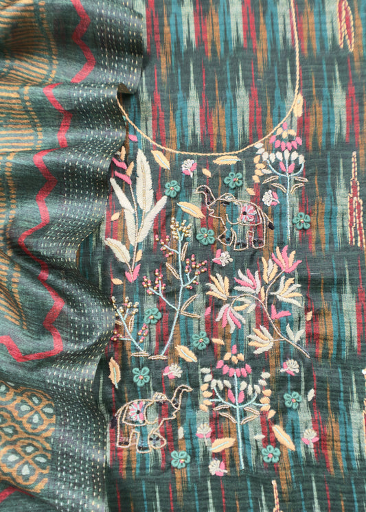 Green Ikkat Art Tussar Unstitched Dupatta-suit with french knot embroidery