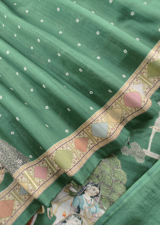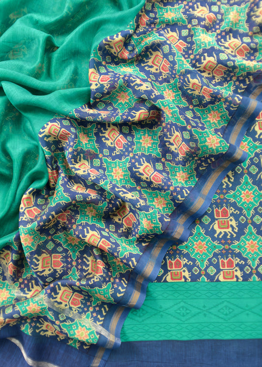 Green With Blue Handloom Patola Unstitched Suit In Maheshwari Silk