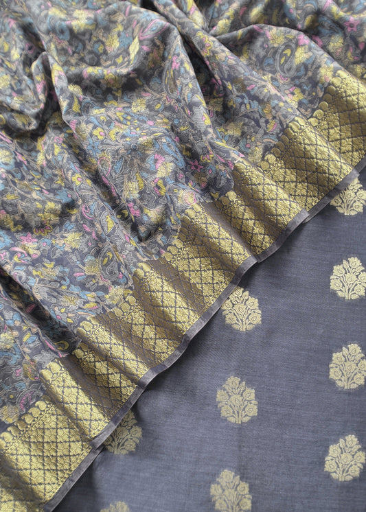 Grey Chanderi Unstitched Dupatta-Suit With Silver Gold Zari Jamdani Weaving
