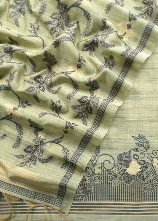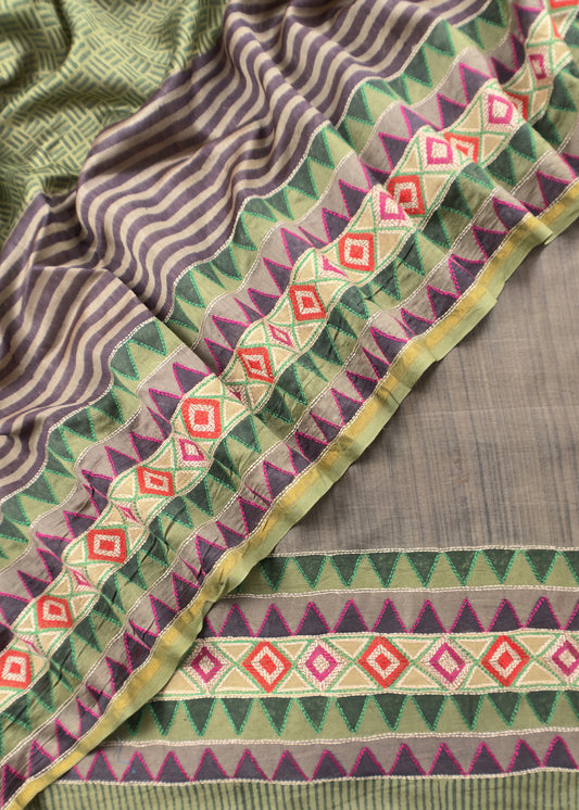 Greenish Brown Maheshwari Silk Unstitched Suit Set With Kantha Embroidery