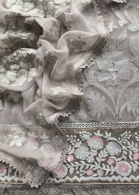 Grey Tissue Kurta With Pure Chiffon Dupatta With Appliqué Work And Hand Work