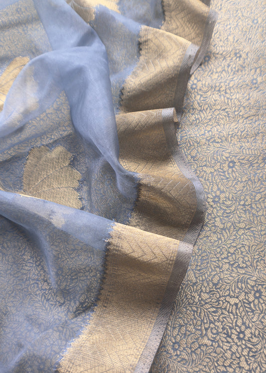 Greyish Blue Brocade Kurta With Organza Dupatta