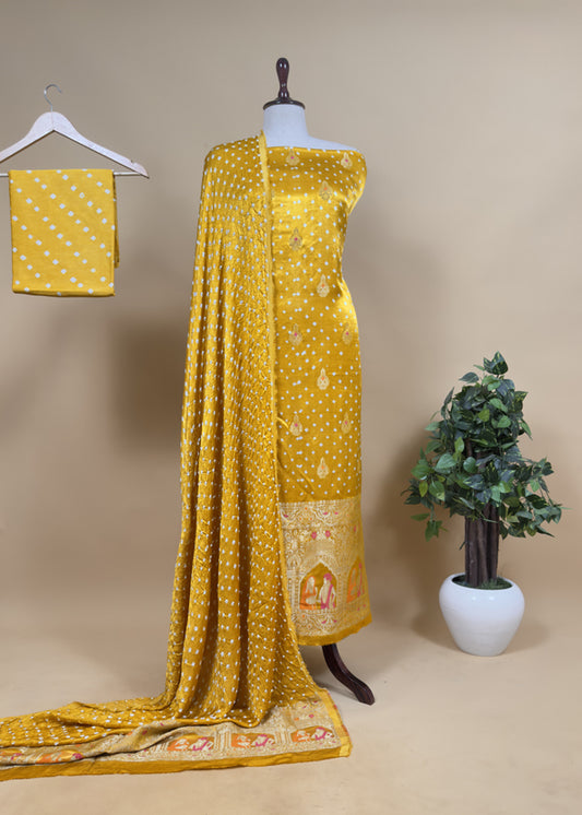 Heer Marigold Yellow Pure Gajji Silk Bandhani Suit With Gold Banarasi Weaving