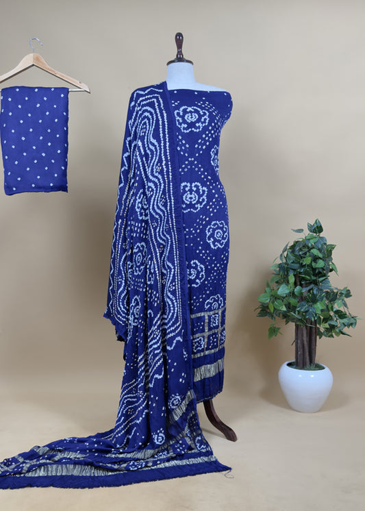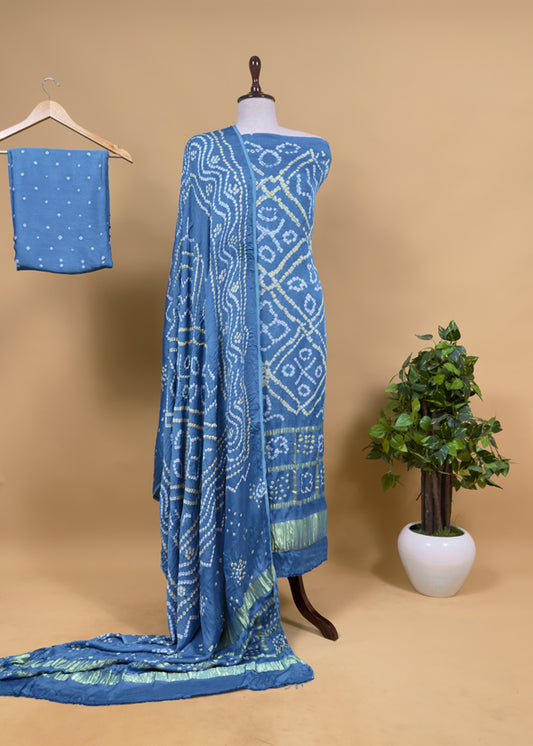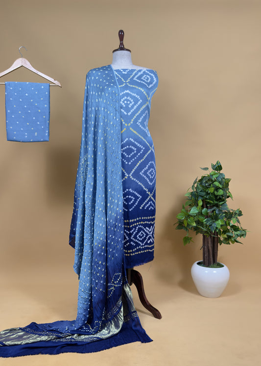 Heer Blue Pure Gajji Silk Bandhani Suit With Gold Lakdi Patta