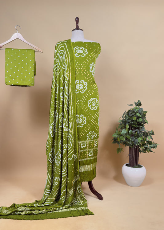Heer Green Pure Gajji Silk Gharchola Bandhani Suit With Gold Lakdi Patta Weaving