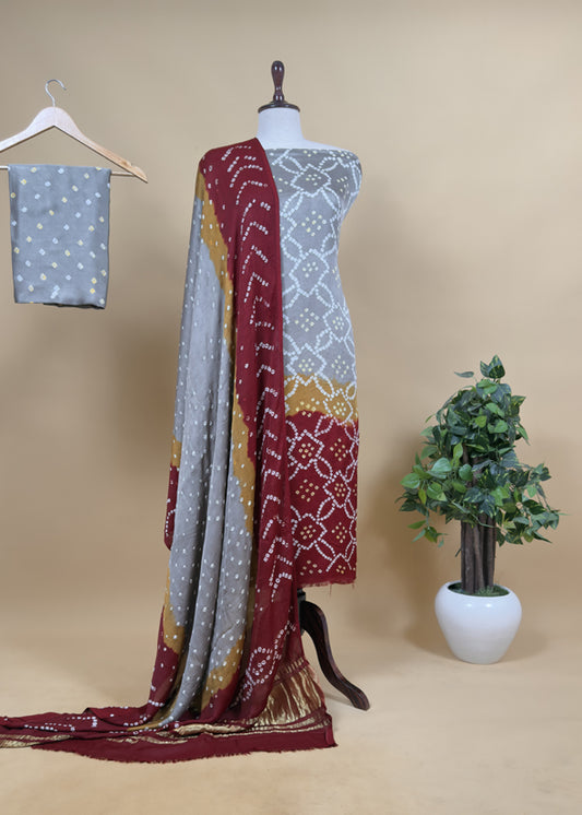 Heer Gray Pure Gajji Silk Bandhani Suit With Gold Lakdi Patta