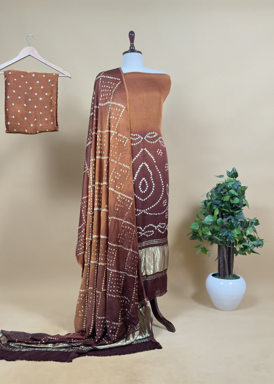 Heer Brown Pure Gajji Silk Gharchola Bandhani Suit With Gold Lakdi Patta Weaving