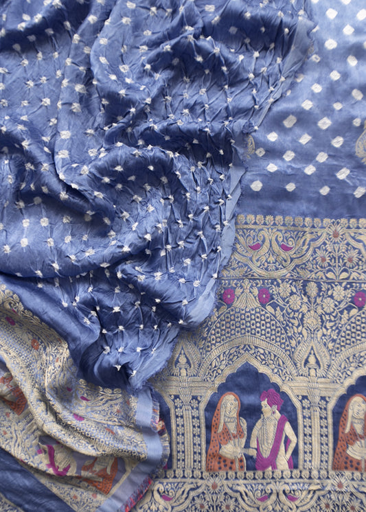 Heer Steel Blue Pure Gajji Silk Bandhani Suit With Gold Banarasi Weaving