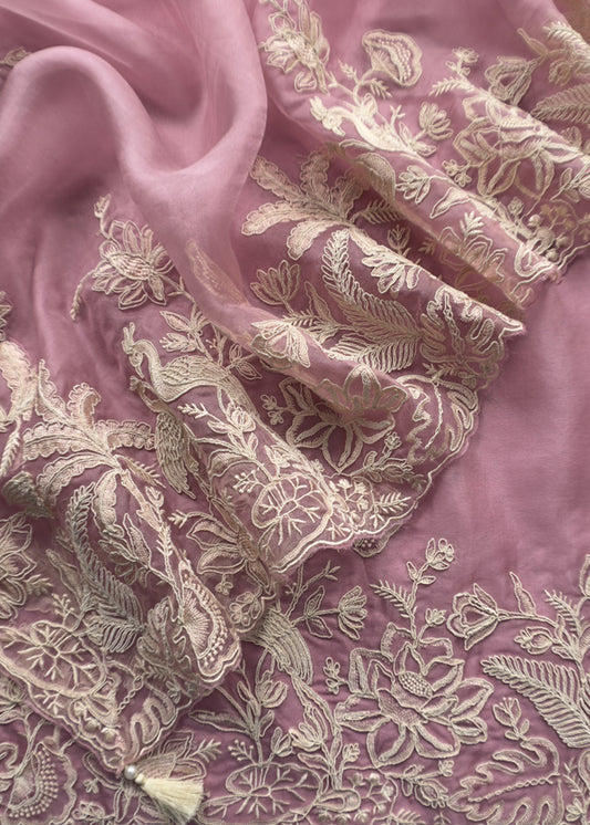 Kalasheel Luxe Lavender Handloom Organza Suit With Garden French Embroidery
