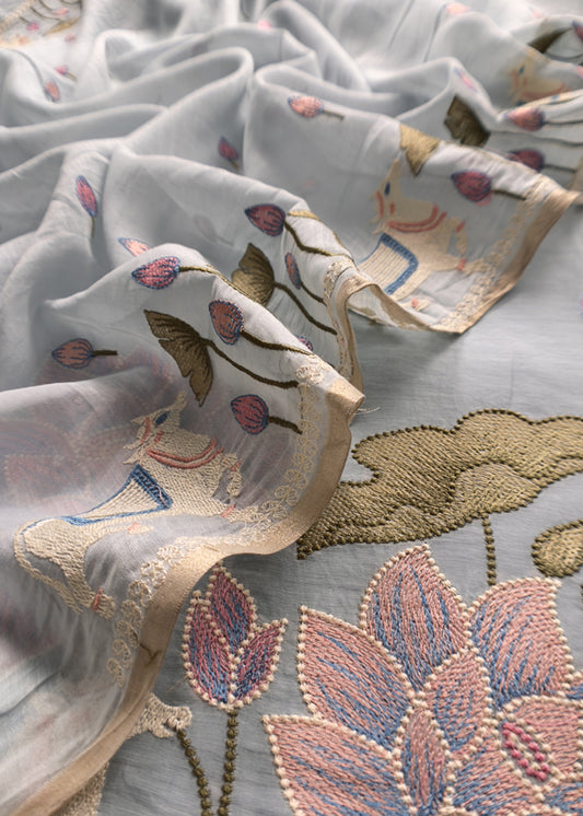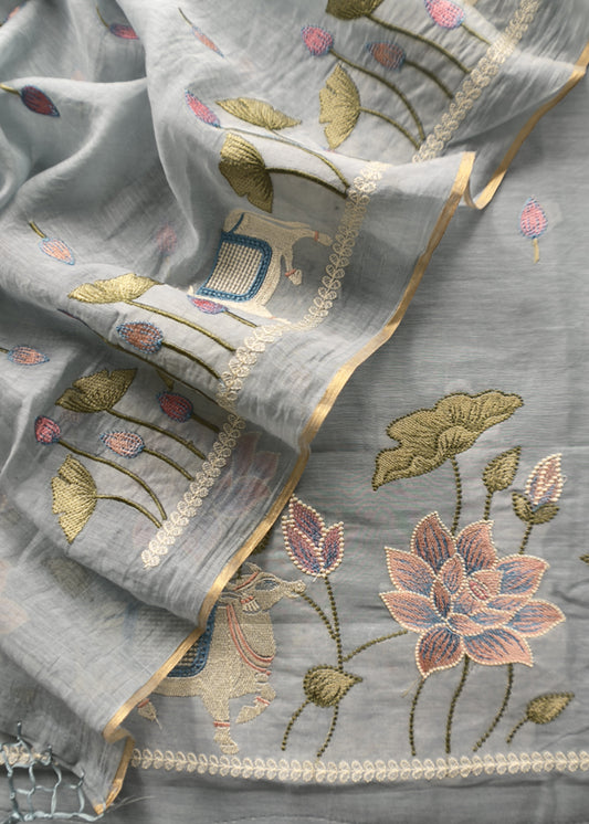 Light Blue Grey Pure Mul Pichwai Unstitched Suit With Pichwai Embroidery