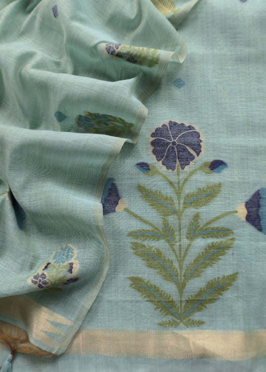 Light Blue Chanderi Dupatta-Suit with Phool Jamdani weaving and gold detailings