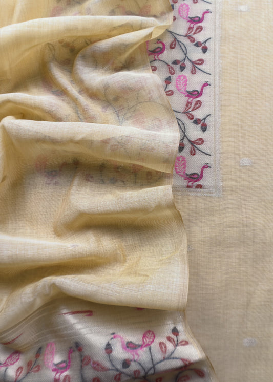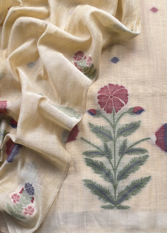 Light Beige Chanderi Dupatta-Suit with Phool Jamdani weaving and gold detailings