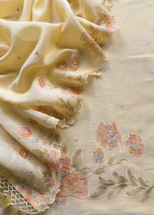 Lemon Yellow Pure Mul Chanderi Suit With Resham Embroidery