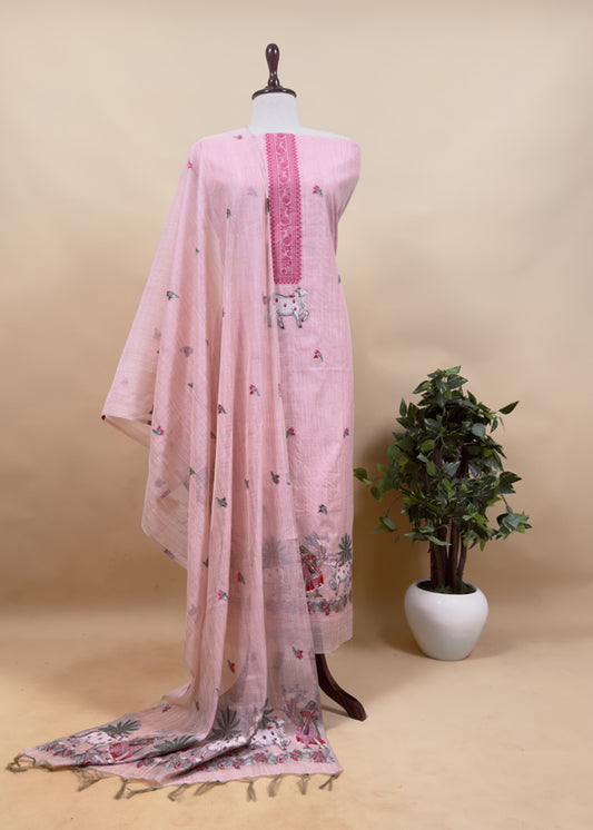 Light Fawn Linen Chanderi Unstitched Suit With French Knot And Kantha Hand Embroidery