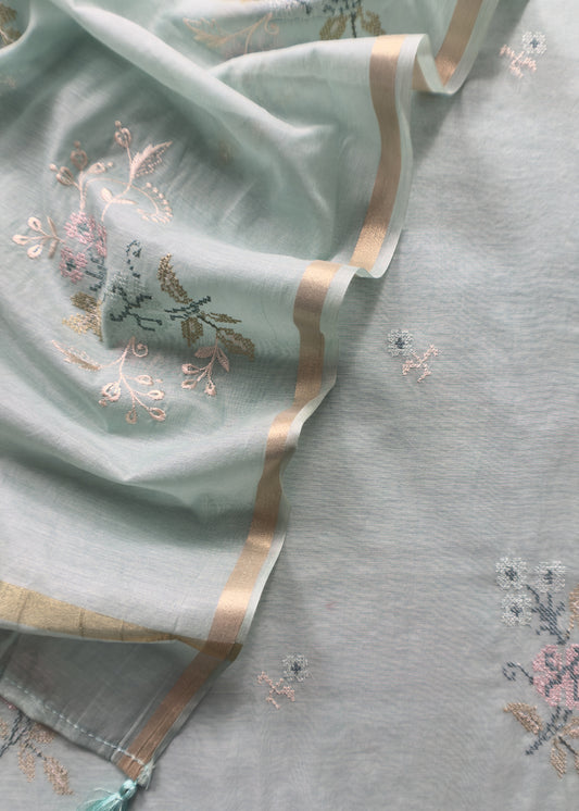 Light Blue Summer Spring Mul Chanderi Suit Set With Resham Embroidery