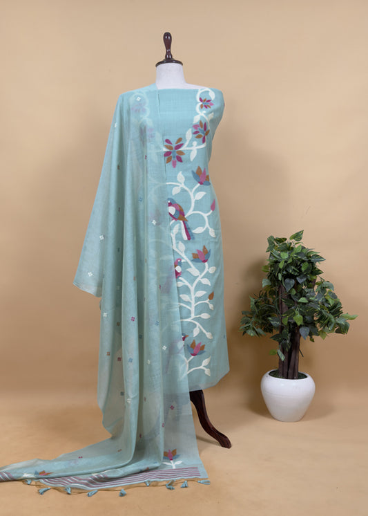 Mehandi Green Kantha Embroidered Unstitched Suit In Handloom Tussar Silk