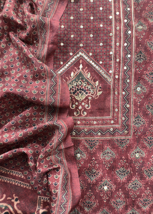 Maroon Unstitched Tussar Suit With Ajrakh Print