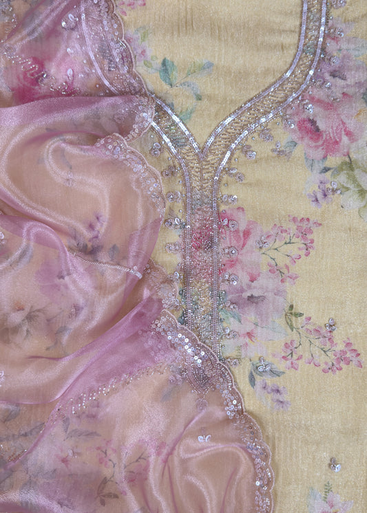 Morning Yellow Floral Pure Tissue Silk Suit With Brush Print, Sequins And Cutdana Work
