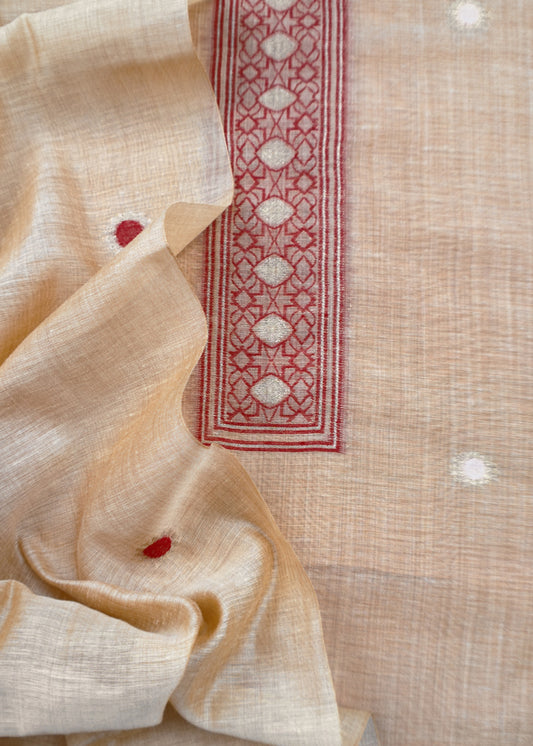 Mustard Linen Chanderi Unstitched Suit With Pichwai Jamdani Weaving