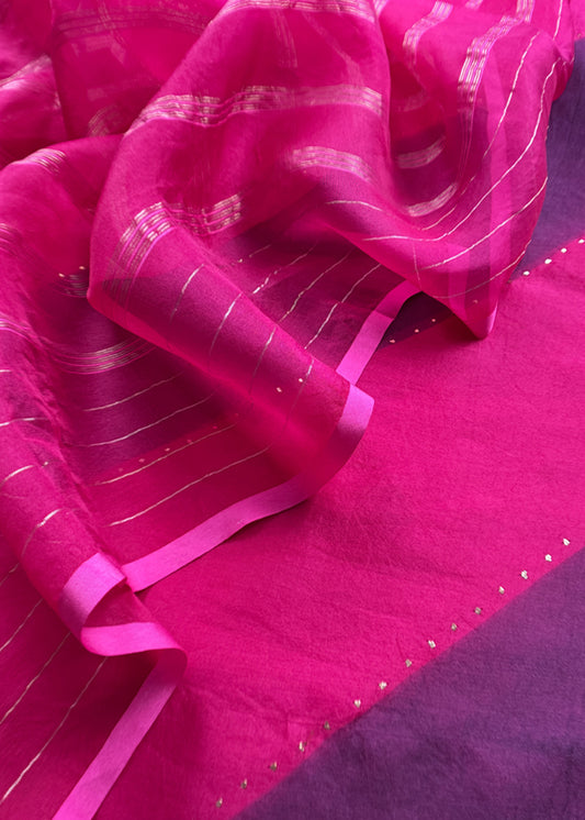 Mexican Pink Chidiya Organza Silk Suit Fabric With Dori, Dabka Hand Embroidery